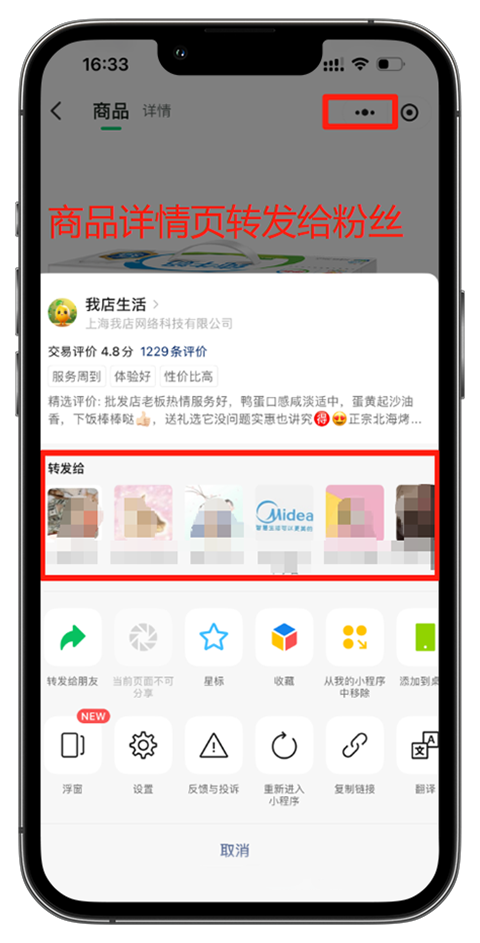 选品官选中商品后,进入商品详情页面,点击商品右上角3个点分享,选择转发给粉丝。