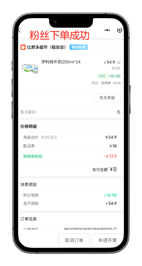 粉丝收到分享商品后,点击商品进入商品详情页立即购买下单。
