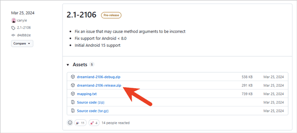 3、梦境框架官方github仓库下载框架(下载地址:https://github.com/canyie/Dreamland/releases),然后在Magisk app中刷入它。从自定义Recovery刷入不再是受支持的安装方式