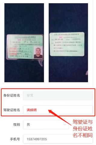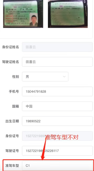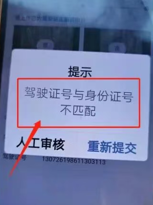 原因2:驾驶证信息与身份证不匹配,注册司机必须提交身份证、驾驶证为同一个人。