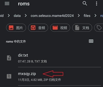 room下载完成后,复制到上面模拟器创建的“默认文件夹”中:手机/Android/data/com.seleuco.mame4d2024/files/roms。