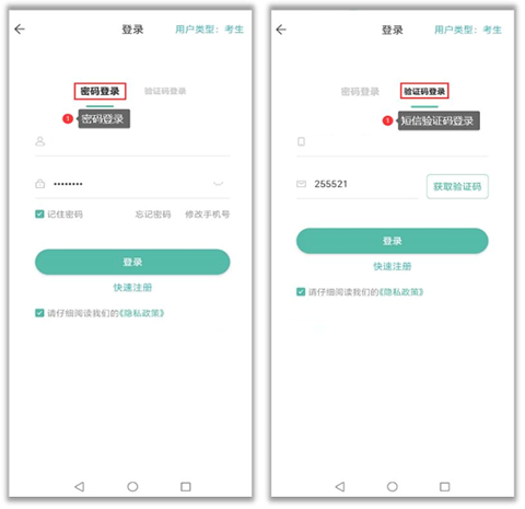 3、考生登录完成注册后便可登录App,可以使用手机号码+登录密码、手机号码+短信验证码两种方式登录App,推荐使用手机号+登录密码方式。