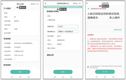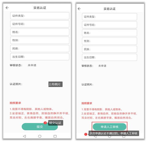 首次登录时App会自动进入实名认证界面,考生必须完成实名认证后才能进行报名等其他操作。进入界面后App会显示考生基本身份信息,考生需上传一张符合要求的照片进行公安实名认证。多次实名认证不通过的App会提示申请人工实名审核,申请后等待审核通过才能进入App主界面进行其他操作。