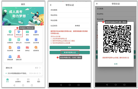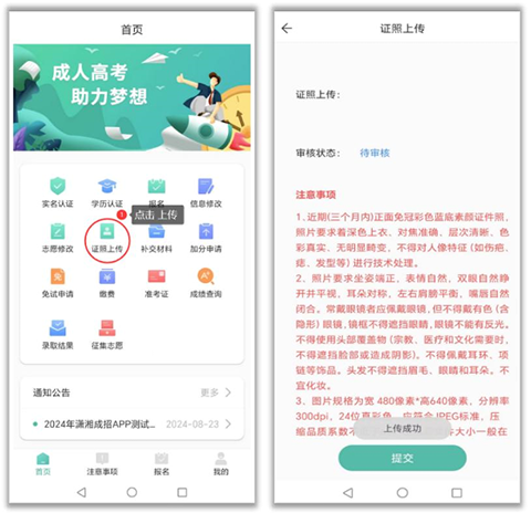 已完成报名缴费的考生应在规定时间内通过潇湘成招App首页“准考证”功能下载打印准考证。