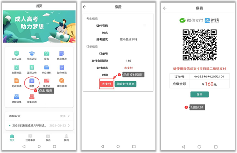 完成报名预约后且学历认证审核通过(针对报考专升本层次考生)、医卫类材料审核通过(针对报考医卫类专业考生)、证件照审核通过(针对全体考生)后可以通过App完成缴费。
