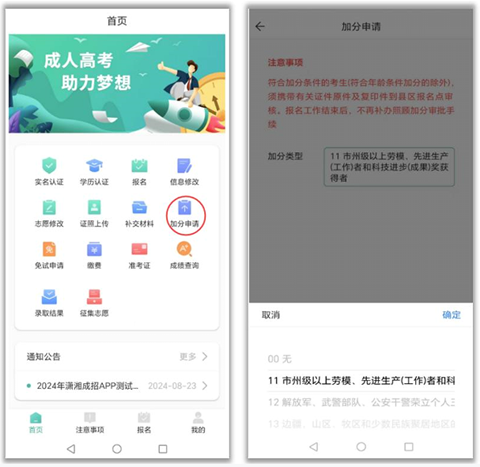 符合加分条件的考生(符合年龄条件加分的除外),可以通过App申请加分,申请后考生本人须携带有关证件原件及复印件到县区报名点审核。报名工作结束后,不再补办照顾加分审批手续。