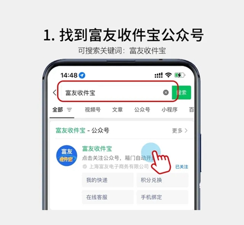 第一步:找到或者点击下方卡片进入富友收件宝公众号,微信中搜索:富友收件宝