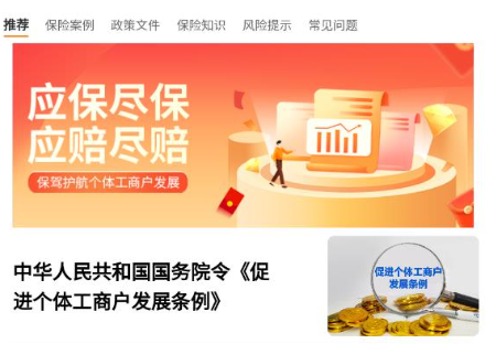个体工商户可线上查看保障方案、在线完善信息、发起理赔申请并跟进理赔流程,同时可接收相关政策宣传和风险提醒,提高风险防范意识。