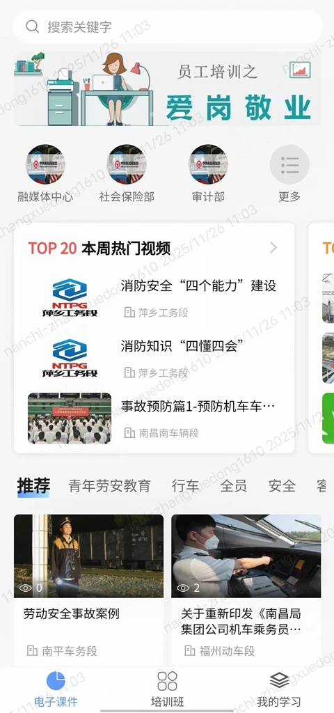 2、工作台集成服务:整合南铁学习云平台、铁路沿线安全环境、双段长系统及智慧食堂等核心功能。