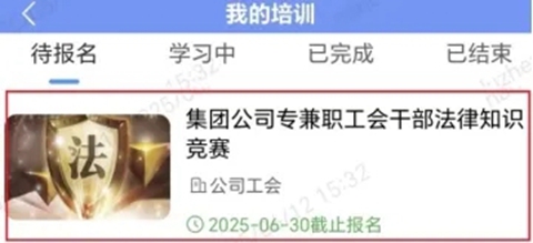 2、报名点击我的学习——我的培训——待报名,找到“集团公司专兼职工会干部法律知识竞赛”,点击进入: