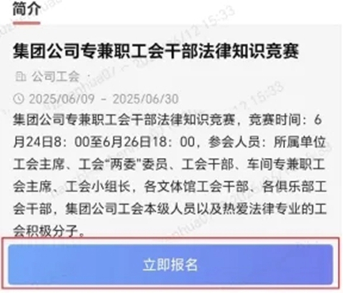 之后,点击立即报名。报名成功后,“集团公司专兼职工会干部法律知识竞赛”会跳转到培训班的“学习中“列表。
