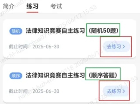 点击我的学习——我的培训——学习中,找到“集团公司专兼职工会干部法律知识竞赛”,点击进入,再点击“练习”栏目;选择适当的练习模式,点击“去练习”按钮。
