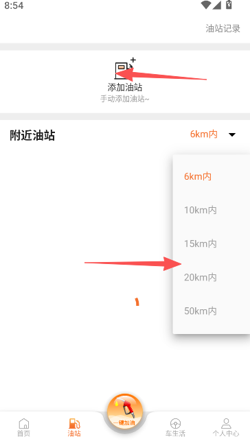 3、根据实际需求,点击筛选距离,然后查看附近加油站点。