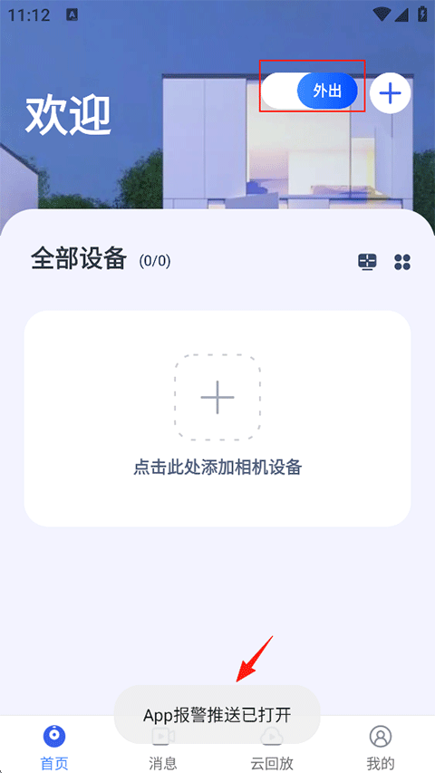 3、切换右上角回家/外出开关可以打开/关闭APP报警推送;