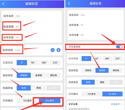 2、如果打印耗材是带孔的服装吊牌卡纸,打印吊牌的时候吊牌的高度要减掉孔距的大小:比如40*100的尺寸,宽度40mm高度100mm,孔的间距常规都是4mm。APP高度要设置为100-4=96mm,如果吊牌高度是120mm,APP高度就设置为120-4=116mm。然后标签间隙选择4。