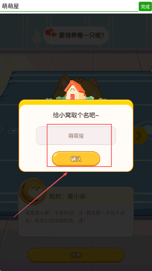 2、选择宠物后输入喜欢的名字完成命名建立连接,为宠物取一个专属名称建立情感连接增强归属感。