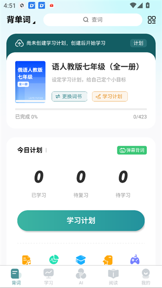 一键开启个性化学习计划,随时高效记忆单词。左上角可自由切换学习类别,让学习更精准、更符合你的目标。