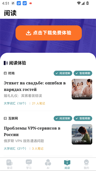 为俄语阅读与听力精心打造的板块。每篇文章配有原声音频,涵盖短文、书籍等多种类型,并每日更新。点击即可沉浸式学习,全面提升听说读能力。
