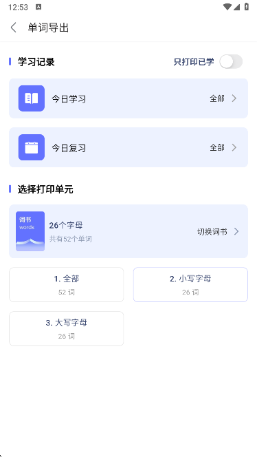 2、然后选出导出单词打印