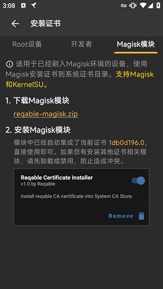若不想Root设备,也可通过Magisk模块管理器进行操作,具体步骤同样可在Reqable应用内查看,官方给出了清晰的免Root证书安装方式。