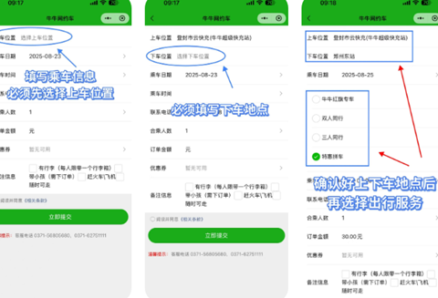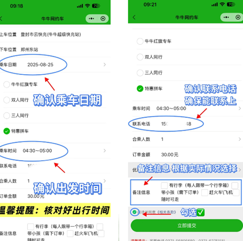 6、在填写完乘车信息和服务类型后,接下来需要确认出行时间,并输入联系电话,最后核对所有出行信息无误后即可提交订单。