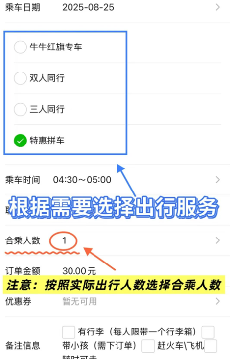 3、接着根据出行需求选择服务类型和乘车人数,目前牛牛网约车提供四种出行方式:牛牛红旗专车、双人同行、三人同行和特惠拼车,不同服务的价格和规则有所差异。