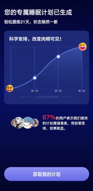 2、接着我们需要填写性别、年龄、每天的运动量、睡前一两个小时主要进行的活动、睡眠质量等信息,填好之后,软件会生成你的专属睡眠计划,点击下方的【获取我的计划即可】;