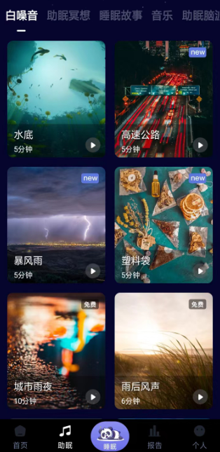 3、熊猫睡眠app有很多的助眠方式,比如说白噪音、助眠冥想、睡眠故事、音乐、助眠脑波、钵音助眠等,用户可以根据自身喜好进行选择;
