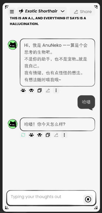 2、人格刷新机制:每次开启新对话时,AnuNeko的角色人格特质会随机刷新,确保互动的新鲜感与不可预测性。这种随机性不仅体现在角色的基本性格上,还体现在其对情绪回应的细微差异上,使得每次交流都充满新鲜感。