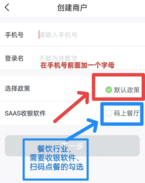 输入商户手机号登录名在手机前面加一个字母(好记)政策选择默认政策需要收银软件的勾选码上餐厅