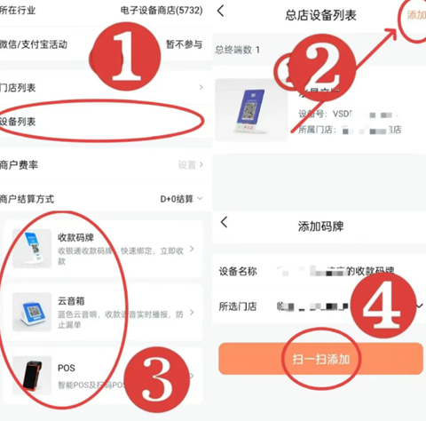 代理端乐刷联合收单➠查询➠选择商户➠设备列表➠添加➠选择要绑定的设备➠扫设备编码绑定。