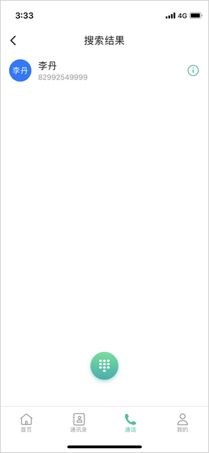 进入通话页面,可使用拨号盘进行点对点呼叫:同企业内直接拨打分机号,跨企业则需输入完整账号。下方“呼叫记录”支持查看历史通话并快速重拨。