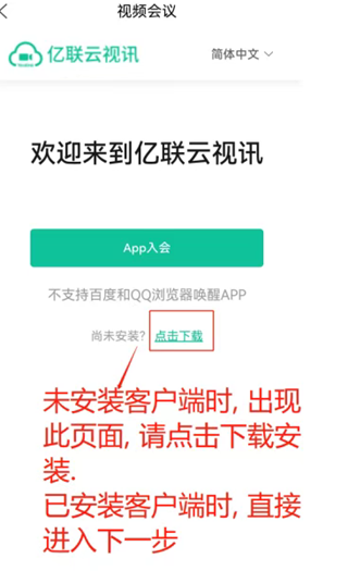 以上操作是基于用户已经注册并登录亿联客户端的界面, 如未注册登录, 亦可入会, 但操作界面会稍微有所区别, 如不会操作, 请注册并登录视频客户端后,再按步骤操作。