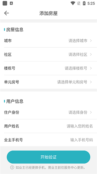 3、输入房屋信息,如城市、社区、楼栋号、单元房号以及用户信息,点击开始验证即可,验证成功后即可绑定成功。