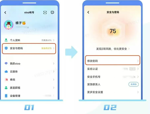 2、已登录vivo帐号:进入“帐号中心”>“安全与密码”>“修改密码”,根据提示操作即可。