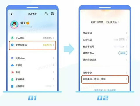 2、已登录vivo帐号:进入“帐号中心”>“安全与密码">“帐号申诉、冻结、注销",根据提示操作即可。