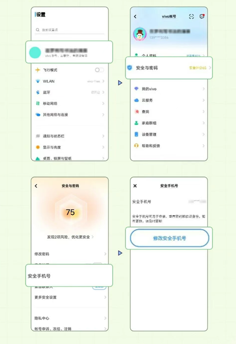 进入“设置”>进入“帐号中心”>“安全与密码”>“安全手机号”,点击修改安全手机号根据提示操作即可。