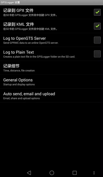 GPSLogger 是一款安卓应用,可将GPS信息记录为多种格式(GPX、KML、CSV、NMEA、自定义 URL),并提供多种上传选项(SFTP、OpenStreetMap、Google Drive、Dropbox、电子邮件)。该应用致力于尽可能节省电池电量。