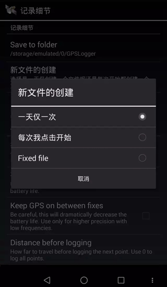 ● 再点击“记录细节”,进入下面的图,在 “新文件创建”里面,选择“一天仅一次”, 这样一天的航迹都在一个文件里面,很方便管理
