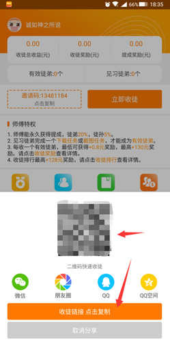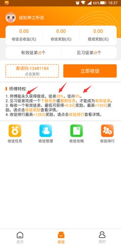 2、在应用内点击下方的【收徒】功能,即可在页面中间查看到自己的邀请码,并找到“立即收徒”的按钮。