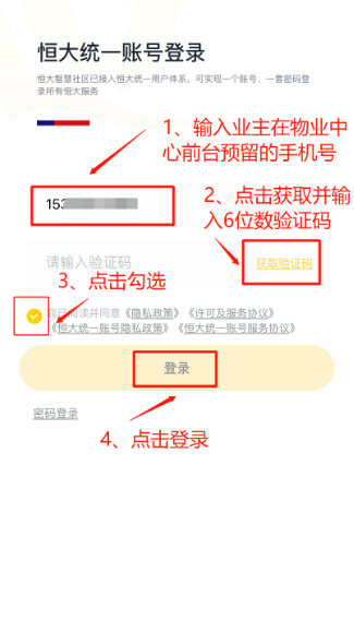 2、业主本人使用其在物业中心前台预留的手机号码进行注册登录