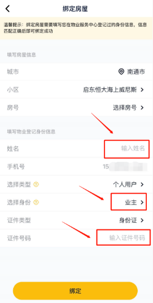6、输入“姓名”-“选择身份”中选择对应的“业主”/“家人”-输入“身份证号” 点击绑定按钮。