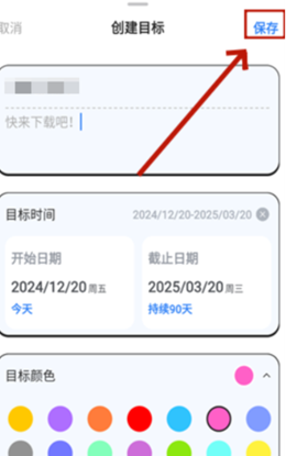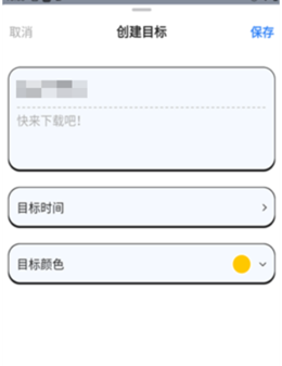 4、用户能够为自己想要创建的目标填写名称,并写一句鼓励自己的话。还可以设置目标的时间,目标的颜色等。