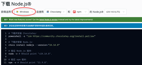 因此,我们这里就先手动安装Node.js,确保100%能成功后再使用官网操作即可。