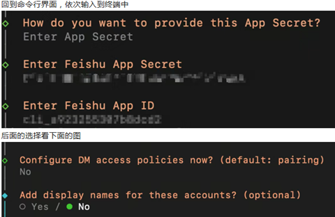 到Enter App Secret这一步时暂停,需要先创建飞书机器人;