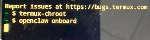 8、 最关键的一步:初始化与绑定,注意先后(启动比较慢耐心等等) 先 termux-chroot后 openclaw onboard;