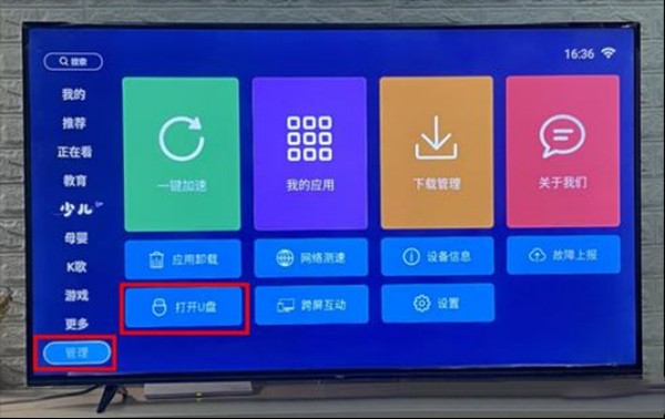 进入后点击【应用管理】,再选择【应用安装】,然后选中插入的U盘并点击打开。