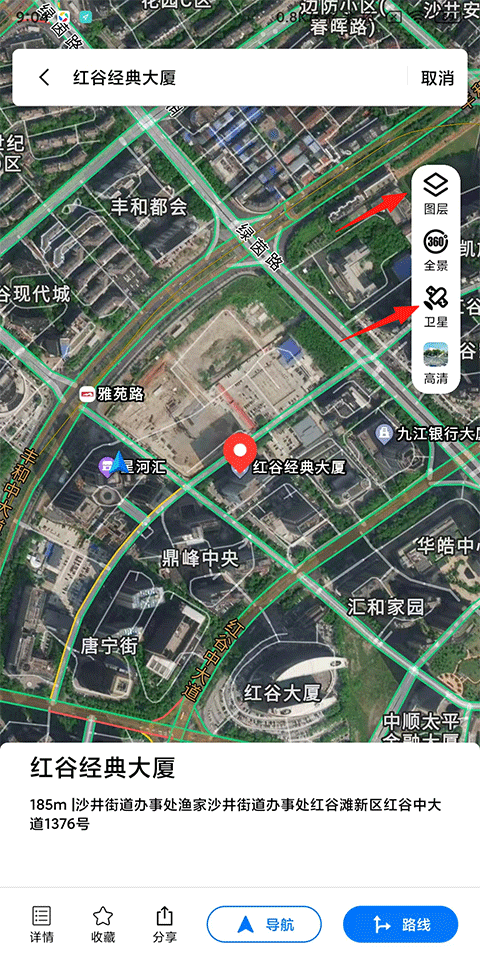 1、打开北斗牛导航App,在首页搜索栏搜索一个位置,提供导航、路线等基础服务,还有图层、全景、卫星、高清等特色服务功能;