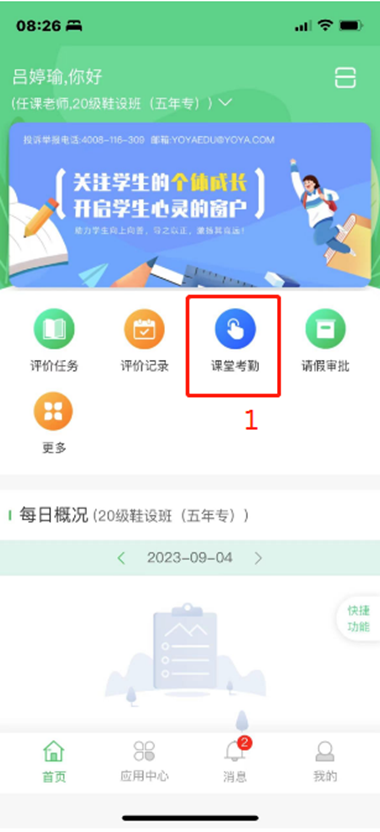 对学生进行考勤,如同时两个班级的两个班级都要考勤。如有代课,也要按上述步骤增加考勤项,并录入考勤。
