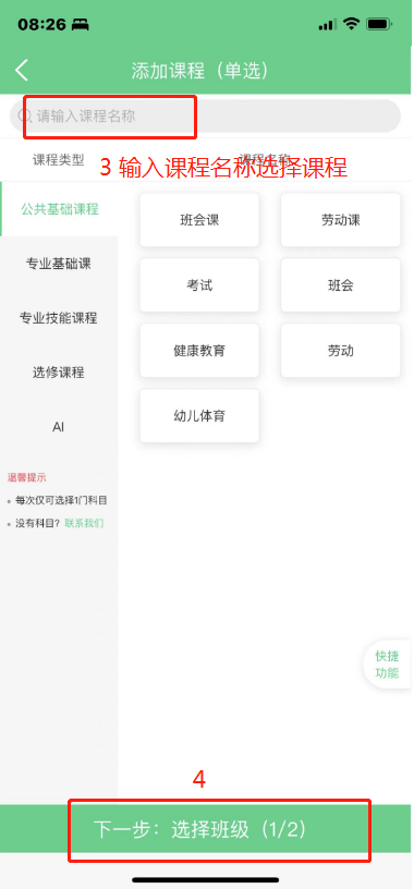 步骤界面首页-课堂考勤-添加考勤项-搜索课程名称并选择-下一步:选择班级(1/2)-选择班级-完成